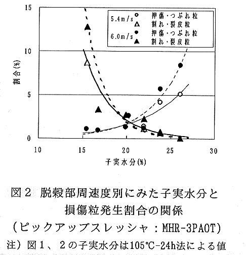- ピックアップ収穫適期は子実水分が18〜26%、すなわち完熟期(熟莢率ほぼ100%)から6日以内であり、脱穀部周速度は子実水分19〜23%の範囲で5.0〜6.0m/s、19%以下、23%以上の範囲では5.0〜5.4m/s以下が適する(図2)。