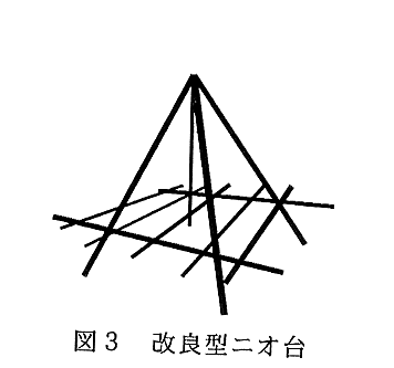 - 機械集積の場合、ニオ自重による下部への圧密抑制と通気性が保たれる改良型のニオ台を使うことにより、積み替えすることなく十分乾燥させることが可能であり、品質のばらつきも小さくなる(図3)。