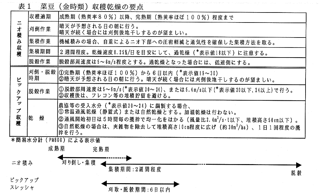- 菜豆(金時類)のピックアップ収穫適条件は完熟期(熟莢率ほぼ100%)から6日以内、脱穀部周速度は子実水分19〜23%の範囲で5.0〜6.0m/s、19%以下、23%以上の範囲で5.0〜5.4m/s以下である。収穫後は堆積貯留を避け、常温通風または自然乾燥で水分調製する。機械集積では改良ニオ台の使用で十分乾燥し、品質のばらつきも小さい。
