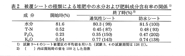 - 透気度が74〜1972sec/100ccと大きな差があるが、無被覆の蒸発量に対する水蒸気透過率が16〜18%である通気性シート(表1)を堆肥列に被覆しても、堆肥列の重量減少率(通気性シート:50%、防水シート:53%)、肥料成分含有率(表2)は被覆資材の違いによる大きな差はみられない。
