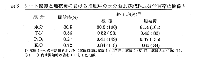 - シート被覆により雨水侵入が抑制されるため、堆肥列の重量減少率はシート被覆では45%、無被覆では36%とシート被覆が高く、堆肥温度は無被覆に比べ高くかつ安定して推移する。また、体積減少率はシート被覆と無被覆による差は小さい。堆肥列中の水分含有率はシート被覆と無被覆では大差はない。また、肥料成分含有率では、リンおよびカリウムではシート被覆により含有率が高く維持される(表3)。