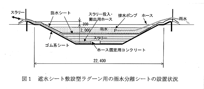 - 面積25m×25mのラグーンでの雨水分離シート(一般名:ブルーシート等)の設置資材費用は176、820円で、面積あたりの単価は約283円/m2である。ブルーシートの耐久性は1〜2年程度であるが、廃棄物貯蔵施設で使用されるプラスチック系防水シート等を用いると耐久性も高く、スラリーの影響を低く抑えることができる。