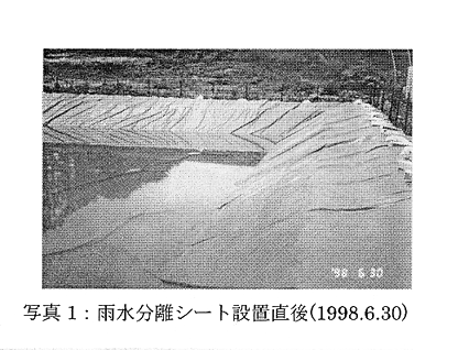 - 雨水分離シートは、ラグーンを空にしてスラリー投入・搬出用ホースを固定し、ラグーン全体を覆う形で広げて設置する。シート周囲はコンクリートブロック等で固定し、速やかにシートの上に水道水等を投入してあおり止めとする(図1、写真1)。