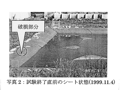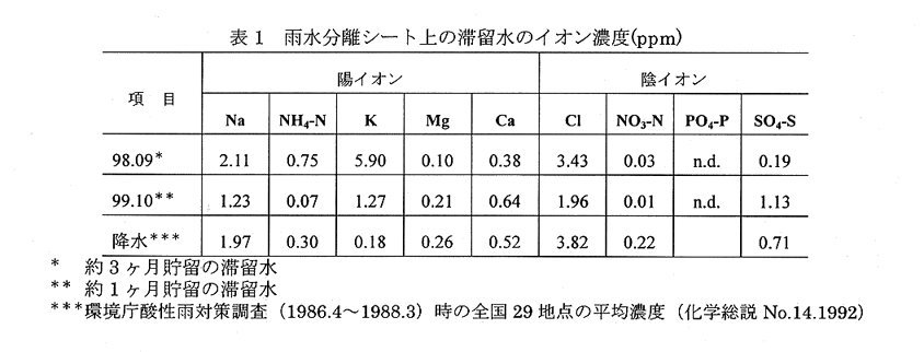 - 雨水分離シート上に鳥類の糞が付着していることや、使用する雨水分離シートの防水特性もあり、滞留水のカリウム濃度が降水の平均的濃度よりも高く推移する場合がある(表1)。また、雨水分離シートは日射等による劣化により、周辺部に破損が生ずる場合がある(写真2)。