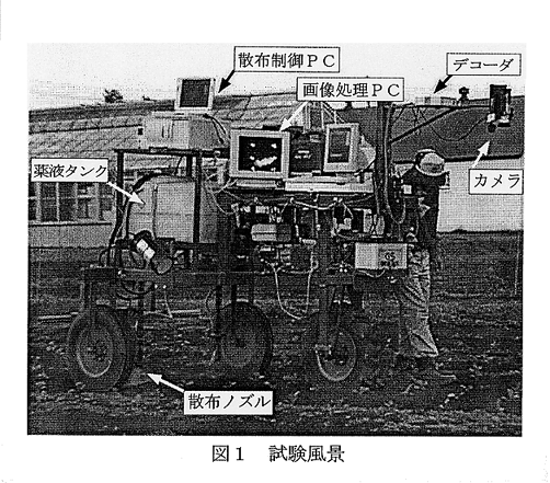 - 減農薬を目的に開発した局所散布システムはビデオカメラで作物を認識して、作物の本体あるいは株間に散布制御することができる。プロトタイプの局所散布機は約0.3m/sの走行速度で作物認識・散布制御が可能である。