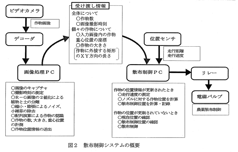 - 散布制御コンピュータは、LANを介して送られてくる作物の撮影時刻、撮影時点の作物の位置データ及び後車軸で測定した速度から作物と散布ノズルの相対的な位置関係を計算し作物の位置を記憶し、この位置情報に基づき電磁バルブを動作させ株間若しくは作物に対し散布を行う。また、同じ作物の位置情報は常に新しい情報で更新される(図2)。