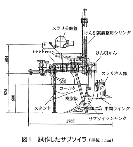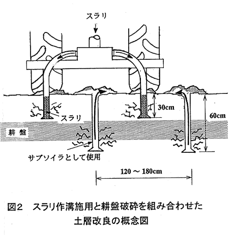 - 作物の根圏環境を改善するため試作したトラクタに直装する追従式サブソイラは、耕盤破砕のみならず高濃度スラリの作溝施用にも使用できる。