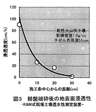 - 本機を耕盤破砕に使用する場合は、中間ウイングを有するシャンク取付けピンの位置を変えて60cmまで延長し、単体で使用する。施工条から側方約20cmの位置まで、土壌破砕による表層の排水性改善効果がある(図3)。シャンク樹脂板の幅は、地表面の露出土塊が鎮圧ローラ1行程で均平可能な4cmが適当である。