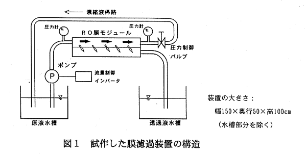- 試作した膜濾過装置は、逆浸透膜(N社製スパイラル型モジュールES10-D2:膜面積1.8m2 )を組み込んだ装置である。装置の構造は単純で、設置に要する床面積も極めて小さい(図1)。