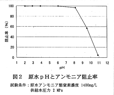 - 無処理のアンモニア含有水は、逆浸透膜では阻止できない。しかし硫酸を添加して中和する前処理を行い、pH6程度の硫酸アンモニウム水溶液とすることにより、99%以上の高い阻止率((1−濾過液濃度/原液濃度)×100)を得ることができる(図2)。