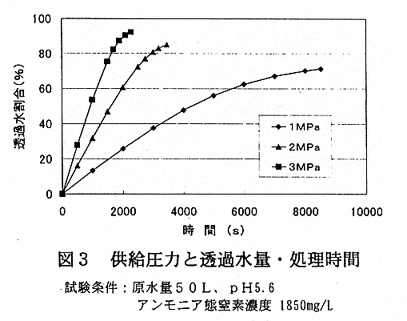 - 前記の前処理を施した原水のアンモニア態窒素濃度が2000mg/L 程度であれば、供給圧力を2MPa以上で処理することにより、原水の8割以上を排水可能な水に浄化でき、同時に濃度の高い硫酸アンモニウム水溶液を得ることができる(図3)。