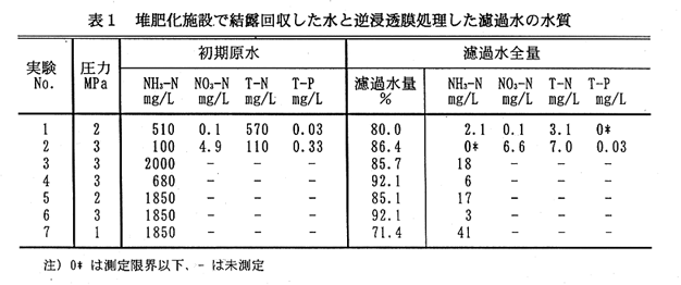 - 堆肥舎で回収された結露水に前処理を施し、その7〜9割の水量を逆浸透膜で濾過処理すると、濾過水は排水基準(日平均:窒素60mg/L)を下回る水質である(表1)。