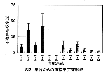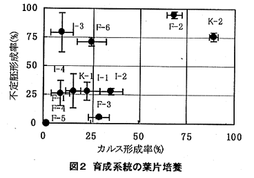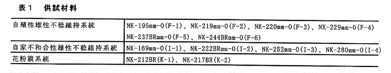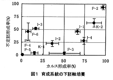 - 特に自殖性雄性不稔維持系統内においては、調査したカルス形成、不定胚形成および直接不定芽形成のいずれの特性においても系統間差が大きかった。「NK-219mm-O」はいずれにおいても高い形成能を示す一方で、「NK-195mm-O」、「NK-229mm-O」および「NK-237BRmm-O」の3系統は全くカルスを形成せず、「NK-220mm-O」は極めて低い不定胚形成率であり、「NK-237BRmm-O」および「NK-244BRmm-O」の2系統は直接不定芽形成を示さないなど、培養の困難な系統が多かった。自家不和合性雄性不稔維持系統内の系統間差は比較的小さかった。