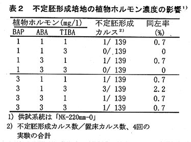 - 不定胚形成率が著しく低い系統「NK-220mm-O」の葉片由来カルスを用いて、不定胚形成培地の3種類の植物ホルモン、BAP、ABA、TIBAの濃度を変更することで、不定胚形成率の向上が見られるかを検討したが、全く効果はなかった(表2)。