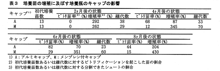- 培養苗の維持は、植物ホルモン無添加の培地で2ケ月毎に継代することで容易に可能であった。培養苗の増殖は、0.1mg/lBAPを含む培地を用い腋芽の伸長を促すことで可能となり、増殖率は3〜4倍程度となった。その際、キャップは、メンブレン付キャップの使用が必須であった(表3)。