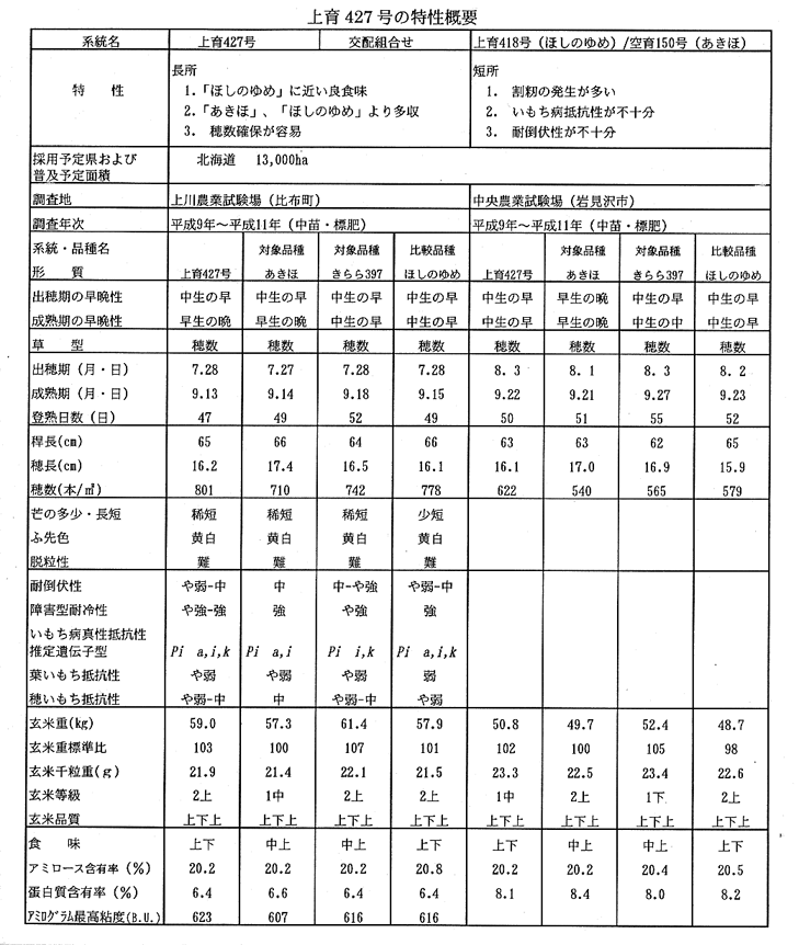 - 水稲「上育427号」は、上育418号(ほしのゆめ)/空育150号(あきほ)の交配組合せから選抜された中生の良食味粳系統である。