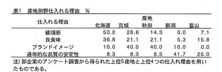 - 卸企業の米を仕入れる理由は「良食味」が最も多く、次いで「値頃感」、「通年的な品質の安定性」、「ブランドイメージ」があげられ、この理由と産地には密接な関係があった(図1)。