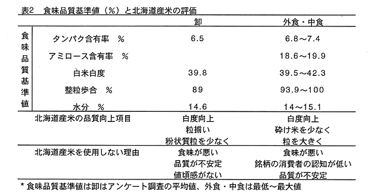 - 北海道産米を使用する理由は低価格が最も多く、使用しない理由は食味が悪いなどであった。北海道産米に求める品質改善項目は「白度の向上」、「砕け米を少なく」、「粒を大きく」、炊飯米に対しては「うまみ向上」、「老化しにくく」などがあげられた(表2)。