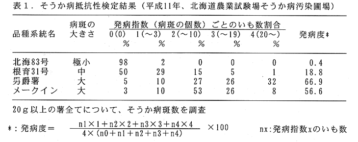 - ばれいしょ「北海83号」は、強度のそうか病抵抗性を示し、そうか病発生地帯でも栽培可能な生食用ばれいしょである。いもは楕円体でラセット皮を有し、粒揃いが良い。目が浅く、変色が少ないので一次加工に適する。長休眠で貯蔵性が良く、長期供給ができる。