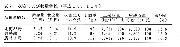 - 熟期は中早生で、収量は「男爵薯」よりもやや多収である(表2)。