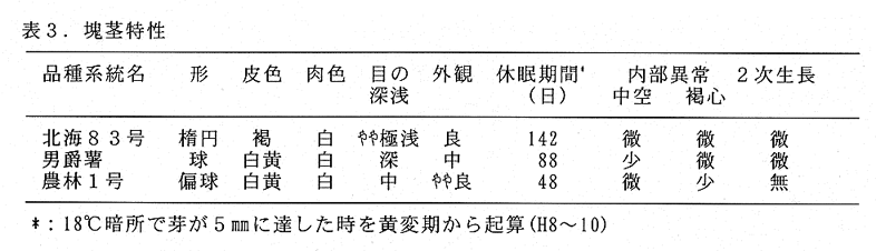 - いもの休眠が長いので、長期貯蔵による利用が可能である(表3)。