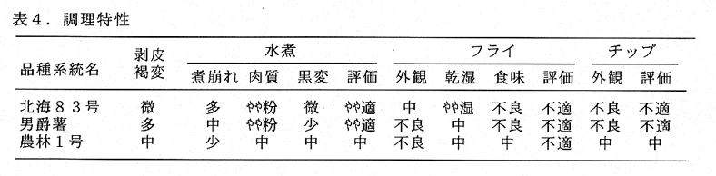 - 「男爵薯」並もしくは優れる調理特性に加え、目が浅いので剥皮時のトリミング数が少なく、生いもの剥皮後および加熱調理後の変色は少なく、業務向けなどの一次加工に適する(表3、4)。