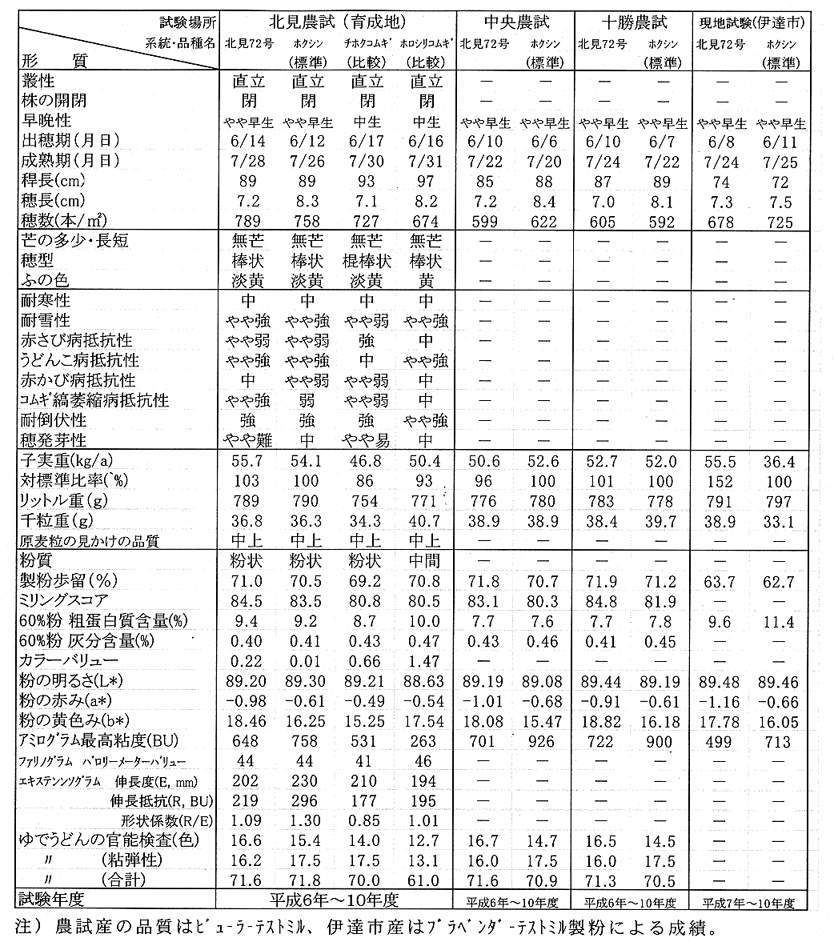 - 「北見72号」は、昭和59年度において、やや早生・耐雪性やや強・多収・良質の「59045」(後の「ホクシン」)を母、穂発芽性難の「北系1354」を父として人工交配を行い、以降選抜、固定を図ったものである。
