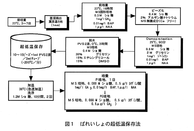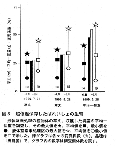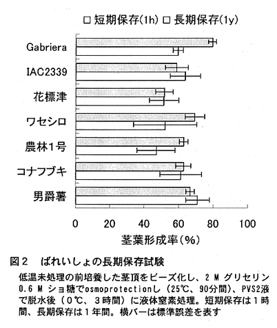 研究課題名:栄養系遺伝資源の超低温保存法の開発と実用化 研究期間:平成11年度(平成8年〜11年) 予算区分:道単 研究担当者:平井 泰、白井 佳代、白井 滋久、高宮 泰宏 発表論文等:Hirai D., Shirai K., Shirai S. and Sakai A., Euphytica 101:109-115,1998