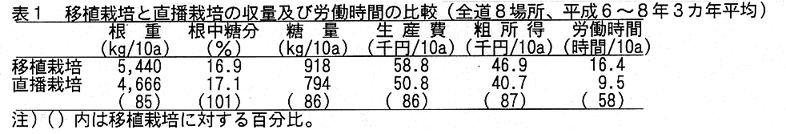 - 現地実態調査の結果、直播栽培は移植栽培と比較して、根中糖分は同等であるが、糖量で14%少ない。また、生産費は14%、粗所得は13%少ないが、労働時間は約4割少なく、大幅な省力化が達成できる。しかし、直播栽培では薬害、風害、湿害、病害、生育障害などの障害によって収量、収益性が大きく低下する事例が認められ、これらの対策が必要である。