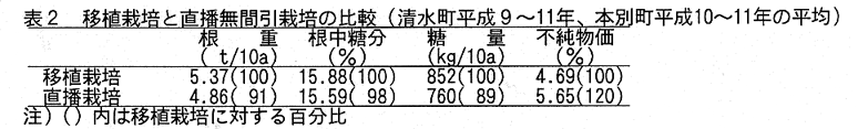 - 改良ペレット、凸型鎮圧輪、作条混和装置付施肥播種機を用いた直播無間引栽培は移植栽培と比較して、不純物価が2割高くなるものの、根中糖分はほぼ同等で、糖量で約1割の減少にとどめることができる。しかし、凸型鎮圧輪処理は、出芽前の強風により鎮圧溝に土砂がたまり、出芽不良となる場合がある。