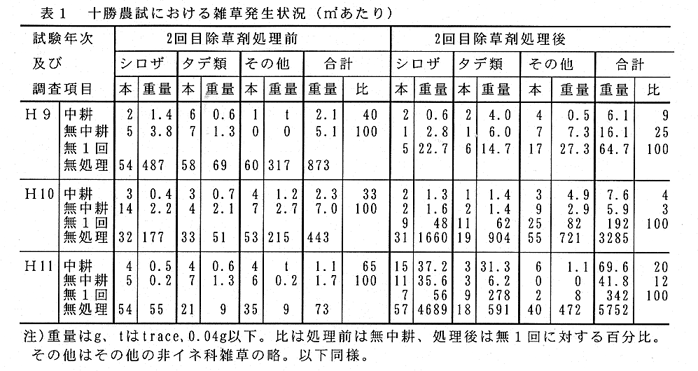- 十勝農試の1回目除草剤処理は平成9、10年は雑草発生揃とほぼ同時期に、11年はやや遅れて行った。除草剤処理による除草効果は2回とも大きかった。2回目除草剤処理前では中耕による除草効果が若干認められたが、2回目除草剤処理後では認められなかった(表1)。
