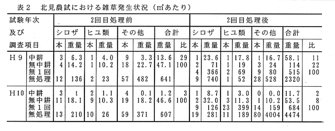 - 北見農試の1回目除草剤処理は両年とも雑草発生揃を過ぎて、てんさい2葉期を待って行った。除草剤処理による除草効果は2回とも大きかった。2回目除草剤処理前における中耕による除草効果は認められた。2回目除草剤処理後においても、1回目除草剤処理で残存した雑草(主にシロザ)に対して除草効果が認められた(表2)。