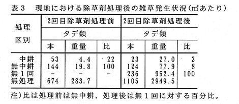 - 現地圃場はタデ類の発生が極めて多かった。1回目除草剤処理は雑草発生揃から遅れて行った。除草剤処理による除草効果は2回とも大きかったが、1回目除草剤処理後に残存したタデは、なお多数認められた。2回目除草剤処理前、処理後ともに、畦間に残存したタデ類に対し中耕による除草効果が認められた(表3)。