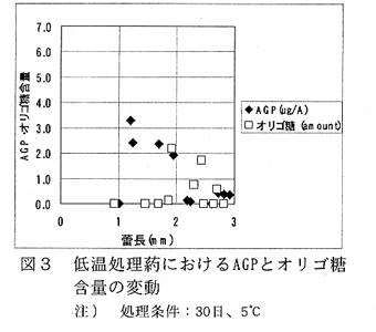 - オリゴ糖及びアラビノガラクタンプロテイン(AGP)の代謝が5℃の処理により阻害され、オリゴ糖含量が低下していることが判明した(図2、図3)。