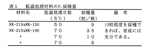- 本手法の低温処理は雌性器官には影響が少なく、採種が十分可能であり、種子の発芽にも問題は見られなかった(表1)。