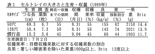- 同一品種内ではセル苗、慣行苗とも観察による草勢の差は認められない。各品種とも、収量・品質はセル苗が優っている。