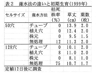 - 活着の促進には、定植前の植え穴潅水(200ml)、または株元近くへの潅水チューブによる潅水が有効である(表2)。
