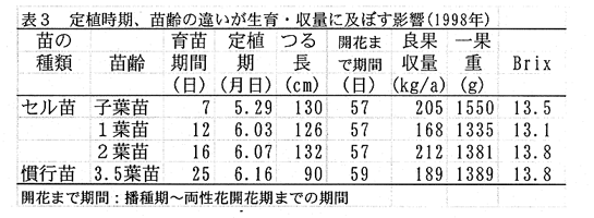- 5月下旬〜6月上旬に定植したセル苗の生育・収量・品質は慣行苗に比べ同等以上の結果が得られる(表3)。
