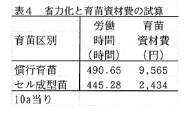 - 播種後1週間程度育苗したセル成型苗(子葉苗)を利用すると、10a当たりの労働時間が約445時間となり、慣行育苗に比べると約10%省力化できる(表4)。