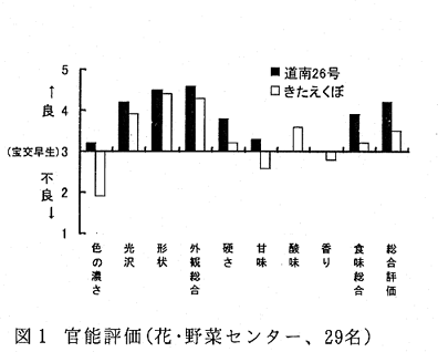 - 糖度はほぼ「きたえくぼ」並で酸度は「きたえくぼ」よりやや低く、糖酸比は「きたえくぼ」より高い。食味は「宝交早生」より良好である。(図1)
