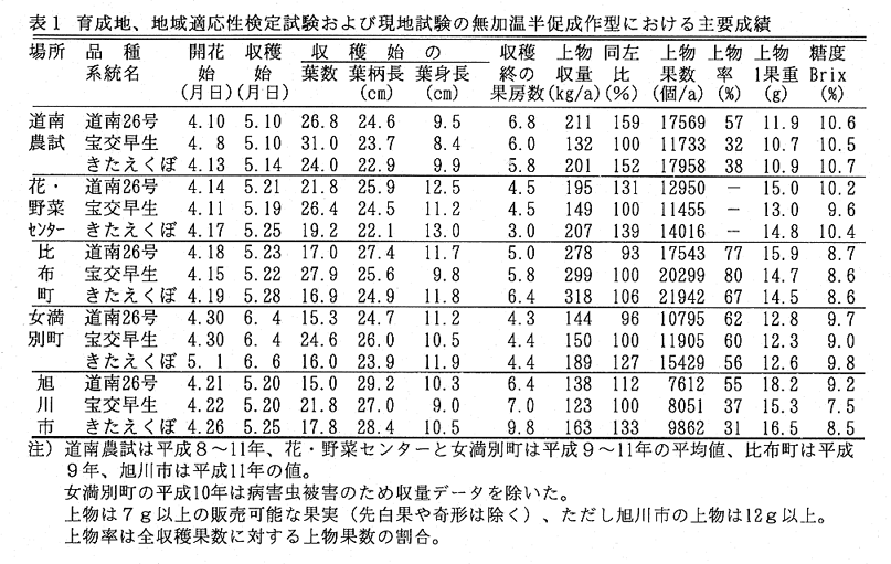 - 現在、無加温半促成用の品種としては「宝交早生」と「きたえくぼ」があるが、「宝交早生」は果実が軟らかく日持ち性、輸送性に劣り、果形が悪いなどの欠点がある。「きたえくぼ」はこれらの欠点が改良された品種で市場評価も高まっているが、収穫始が「宝交早生」より遅いことや先白果が発生し易いことなどから作付面積は25ha弱にとどまっている。「道南26号」は、熟期が「宝交早生」並の早生で、果実品質(食味、硬度、日持ち性)が「きたえくぼ」並で障害果の発生が少ないことを目標として育成された。