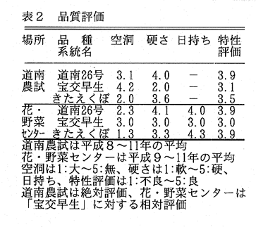 - 果実硬度は「きたえくぼ」より硬く、光沢に優れ色むらが少なく、先白果の発生は認められない。中心空洞は「きたえくぼ」より明らかに小さい。(表2)そう果の着色は少ないが本道の市場では問題はない。