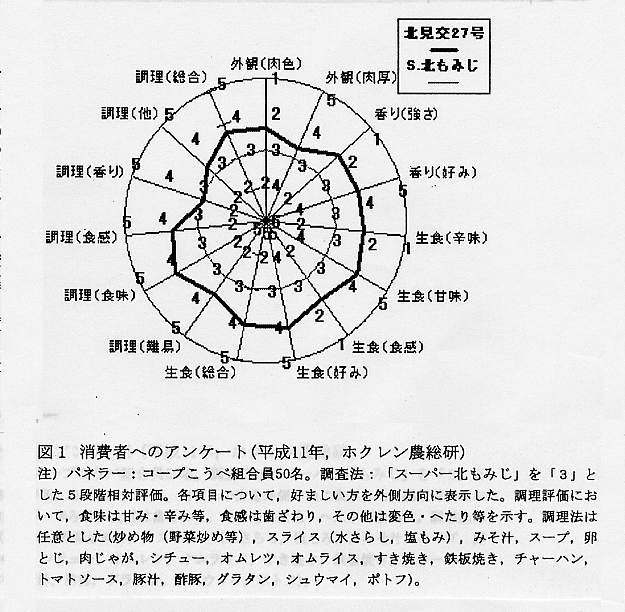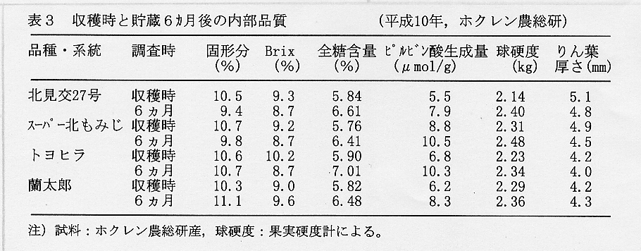 - りん葉は厚く、球の硬さは「ツキサップ」、「トヨヒラ」と同等か、やや軟らかい(表3)。辛さの指標となるピルビン酸生成量は低く、貯蔵中の増加も少ない傾向である。生サラダ、ソテーの食味評価は一般の春播き品種に比較して高い(図1)。外皮色の濃さは「ウルフ」より劣るが、「トヨヒラ」並である。