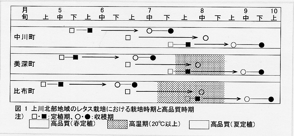 - 目標とする糖度3度は糖含量2g/100gに相当し、収穫2週間前の平均気温が18℃以下の作期は糖含量2g/100g、ビタミンC含量6mg/100g(4訂食品成分表)以上となり、図1に示した作期で内部品質に優れたレタス生産が可能である。