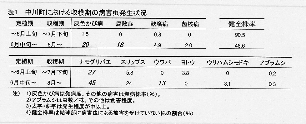 - 7月収穫レタスは内部品質に優れ、病害虫の発生が少ない。一方、9月収穫レタスは内部品質は高いが、病害虫の被害が結球部にまで及ぶことがあり、病害虫防除が必要である(表1)。