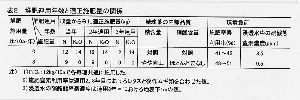 - 堆肥の3t/10a・年連用により3年目では50%の窒素とカリの減肥ができた。加えて、糖含量の増加と硝酸含量の減少により、内部品質は向上する。しかし、地表下1mの浸透水中の硝酸態窒素濃度(基準値10ppm以下)より堆肥の連用は3tでも3年が限界である。環境負荷の軽減を目指しての投入可能な堆肥量・年数の検討が必要である(表2)。