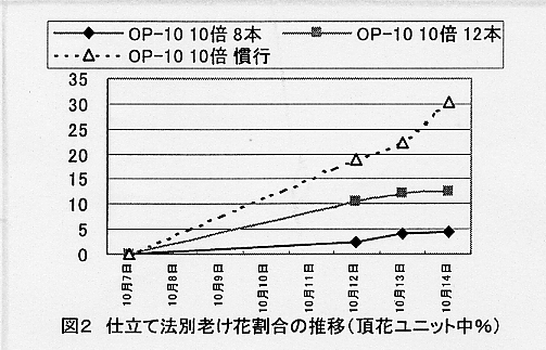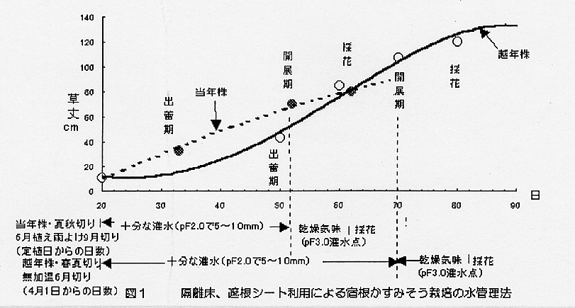 - 定植後はpF2.0程度を灌水の開始点とし、1回の灌水量は生育状況によって5〜10oで調節する。開花枝展開期以降はpF2.9程度を灌水の開始点とし、乾燥気味に管理する(図1)。