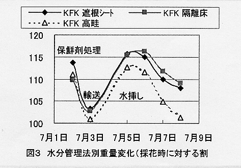 - 多茎栽培、隔離床栽培、遮根シート栽培した切花は吸水能力が高く、保鮮剤処理および水挿しにおける重量増加が大きく、かつ輸送中の重量減少も少なくなり、採花後の老け花が抑制される(図2、3)。