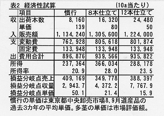 - この多茎栽培により総労働時間は若干増えるが、採花・調製労力が軽減される(表1)。多茎栽培は慣行栽培よりも所得の変動が少なく、収益性の高い栽培法である(表2)。