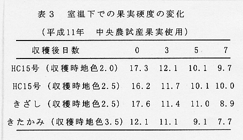 - 果肉質は「きたかみ」、「きざし」より優れる。食味は「きざし」より優っている。糖度は12.5〜13.5%、酸度は0.7g/100ml前後とやや酸味が多いが夏に食べる果物としてさわやかである(表2)。日持ち性が優れており、室温下でも果肉が軟化しにくく、適食期間は収穫直後から6〜7日間である(表3)。
